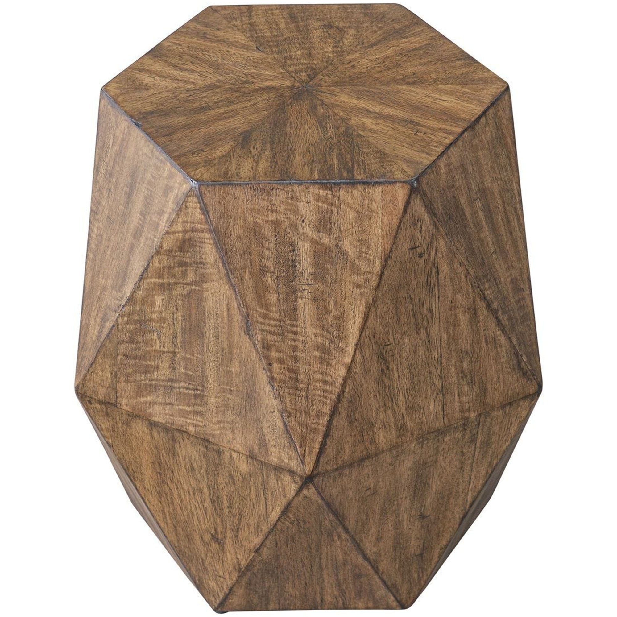 The Volker Accent Table features a multifaceted geometric silhouette that brings a bold architectural presence to any seating arrangement. It showcases a flat hexagonal top surface with a decorative sunburst pattern, providing a secure and functional area for resting a beverage or small accents. The body is composed of irregular triangular planes that taper toward the base, creating a highly sculptured and dynamic profile. This continuous monolithic structure ensures a stable footprint while maintaining a clean modern aesthetic. This well proportioned design effortlessly merges complex geometry with practical utility to anchor a contemporary interior.