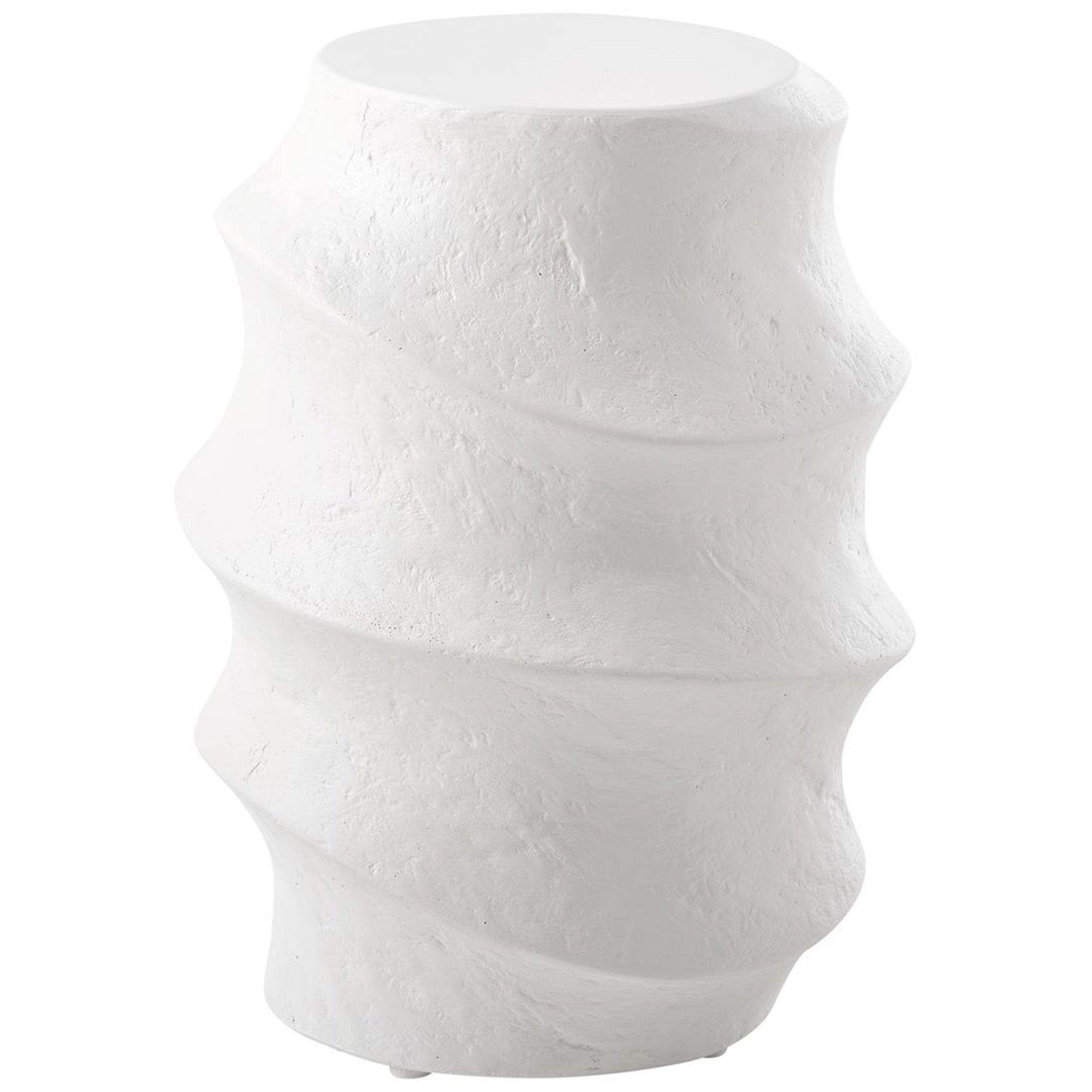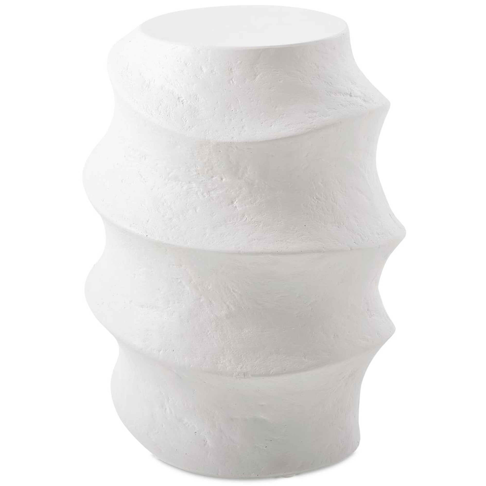 The Winded Accent Table features a bold, sculptural silhouette with a dynamic, undulating form that brings a sense of fluid movement to any interior or exterior living space. It showcases a smooth, perfectly flat round top, providing a stable surface for displaying decorative accents or resting a beverage. The body is defined by continuous, wavy horizontal ridges that wrap around the cylindrical profile, creating a highly tactile and visually engaging rhythmic pattern. This sturdy, monolithic design offers a contemporary yet timeless aesthetic, serving as a versatile functional piece that grounds a seating arrangement with its compelling organic geometry.